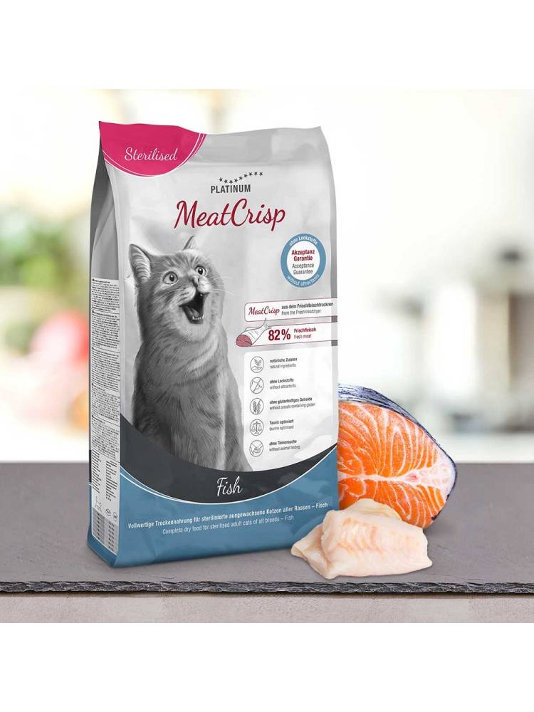 Η PLATINUM MeatCrisp είναι η πρώτη πλήρης τροφή για γάτες από φρέσκο κρέας. Περιέχει φυσικά μικροθρεπτικά συστατικά και τα αμινοξέα που βρίσκονται στο φρέσκο κρέας, καθιστώντας το PLATINUM MeatCrisp καλύτερο υποκατάστατο για τη λεία των γατών από τις περισσότερες εμπορικές τροφές για γάτες. Με την PLATINUM MeatCrisp, η γάτα σας θα αισθάνεται πιο ισορροπημένη και επομένως πιο χαρούμενη. Η τραγανή μπουκιά και η κρεάτινη γεύση κάνουν την PLATINUM MeatCrisp τόσο επιθυμητή που οι γάτες δεν θα θέλουν να την σταματήσουν. Η PLATINUM MeatCrisp δεν περιέχει κανένα ελκυστικό.