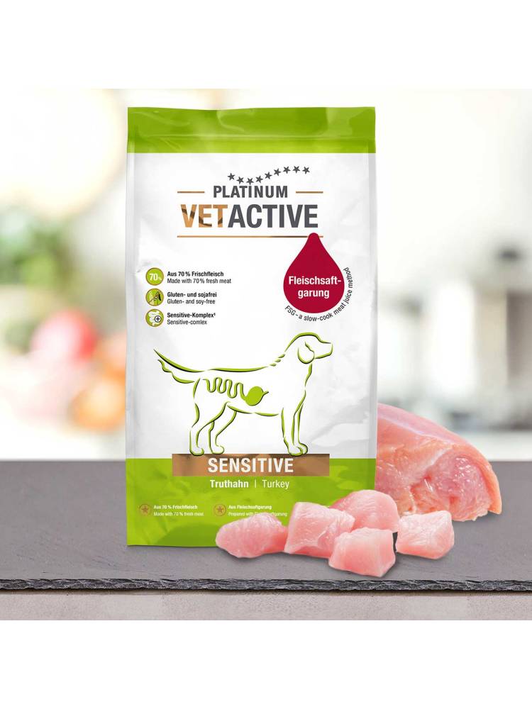 Για σκύλους με γαστρεντερική ευαισθησία. Σήμερα, όλο και περισσότεροι σκύλοι υποφέρουν από συχνές διάρροιες και γαστρεντερικά προβλήματα. Με την κλινική μαγειρευτή ξηρά τροφή PLATINUM VET ACTIVE Sensitive προσφέρουμε στον τετράποδο φίλο σας πλήρη διατροφή με προσεκτικά επιλεγμένα, καλά ανεκτά και εύπεπτα συστατικά. Η υψηλή περιεκτικότητα σε φρέσκο κρέας 70% κάνει την τροφή μας ιδιαίτερα εύπεπτη και μια πραγματική γαστρονομική εμπειρία για ευαίσθητα σκυλιά. Εάν τα γαστρεντερικά προβλήματα επιμένουν για μεγάλο χρονικό διάστημα, θα πρέπει να εξεταστεί ο σκύλο σας από κτηνίατρο.