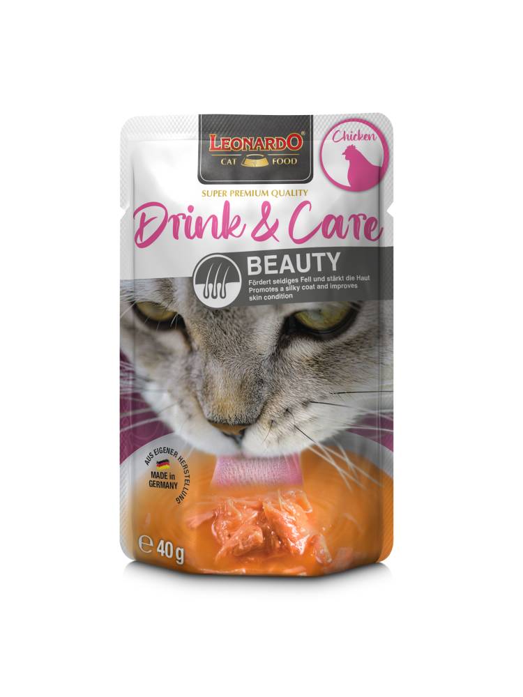 Γεύση που εντυπωσιάζει: Ο τετράποδος φίλος σας θα χαρεί να σας δείξει πόσο πολύ απολαμβάνει το LEONARDO Drink & Care Beauty. Για παράδειγμα, θα το επιδείξει με ένα μεταξένιο, λαμπερό, απαλό τρίχωμα χάρη στα ωμέγα-3 λιπαρά οξέα υψηλής διαθεσιμότητας! Αυτό το νόστιμο «πρόγραμμα ομορφιάς» με ζουμερά κομμάτια κοτόπουλου σε ένα λεπτό ζωμό κοτόπουλου προάγει επίσης την πρόσληψη υγρών—ιδανικό ως συμπλήρωμα στην ξηρά τροφή.